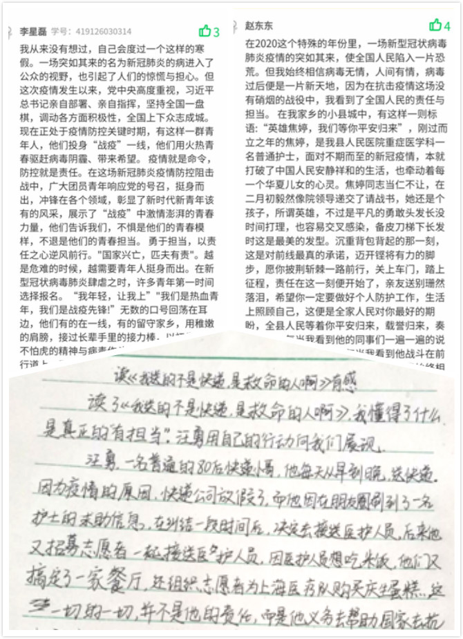 在线交流感悟时,同学们激动地写道:“国家兴亡,匹夫有责。在这场战役中,广大青年党员、团员积极响应党的号召,挺身而出,冲锋在前,他们的表现彰显了蓬勃的中国力量和青年一代的担当!”“微善集大爱,同心克时艰。这场战役让我们看到了中国人民的力量,看到了社会主义中国的制度优越性!”
