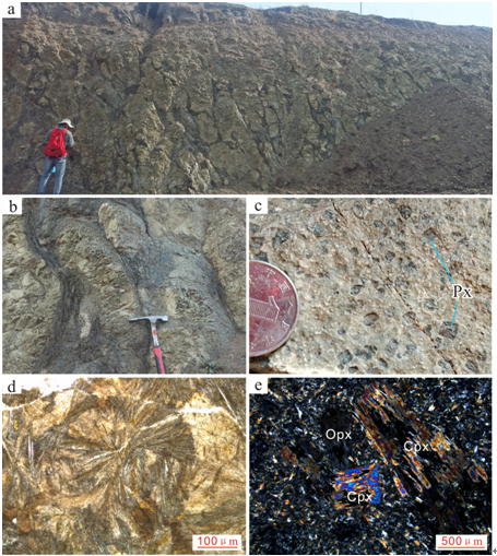 (a)枕状FAB宏观野外露头;(b)单个枕状FAB野外露头;(c)富含辉石斑晶的玻安岩野外露头;(d)枕状FAB的球颗结构显微镜下照片;(e)含单斜辉石和斜方辉石斑晶的玻安岩显微镜下照片