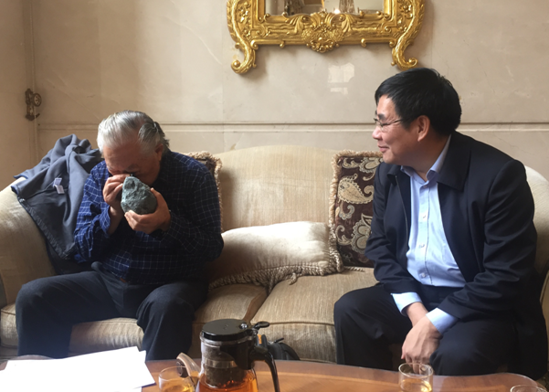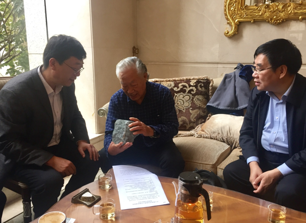 宋瑞祥老部长在认真观察BB贝博研究团队采集的金伯利角砾岩标本