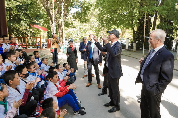 在博物馆外,德国代表团与参观BB贝博博物馆的小学生亲切互动