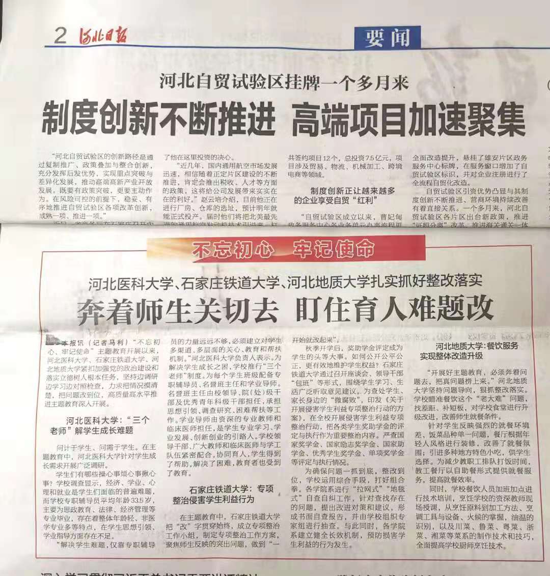 今天,河北日报在第二版就我省高校开展“不忘初心、牢记使命”主题教育进行了跟踪报道,其中报道了BB贝博在主题教育开展期间,坚持问题导向,狠抓整改落实,率先瞄准餐饮问题,找差距、补短板,对学校食堂实现了整体改造升级,改善师生就餐条件的情况。