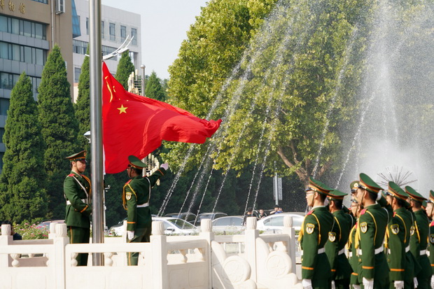 在升旗仪式上,国旗护卫队迈着整齐的步伐来到国旗台下,嘹亮的国歌响起,全场师生行注目礼,高唱国歌,注视着鲜艳的五星红旗冉冉升起。