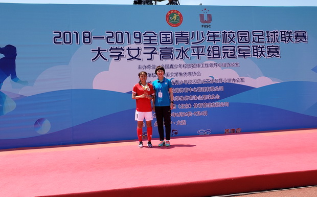 BB贝博女子足球队在体育部党支部书记董彦芳和张杰、胡健两位老师带领下,于2019年6月24至7月4日在大连体育中心参加了全国大学生高水平组冠军联赛。这是BB贝博艾弗森官网女子足球队成立三年以来,第一次参加全国十一人制足球比赛。此次赛程历尽10天,共六场比赛,女足姑娘们最终取得四胜一平一负的佳绩,是全赛事进球数最多的队伍,共进球19个。比赛过程中,大家斗志昂扬,顽强拼搏,不放弃不服输,通过队友间的默契配合、强势助攻,会计学院赵博同学打进8球,荣获大赛最佳射手称号。
