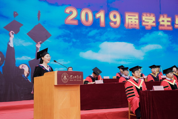 本科毕业生代表、法政学院张彤同学发言,回忆了在学校生活的点点滴滴,感恩母校“仰山之高,慕水之善”的博大包容和谆谆教诲,感恩母校给予同学们积极向上的校园环境;感恩即将离别的老师,他们“无私奉献,诲人不倦”的师者姿态,带领同学们遨游在知识的海洋;感恩即将挥手告别的朋友,彼此“亲密无间、推心置腹”的纯洁友情,填充了同学们远在他乡的离愁。她表示,“河北地大学子”将永远是同学们最骄傲的身份,毕业后,同学们一定会常回家看看。