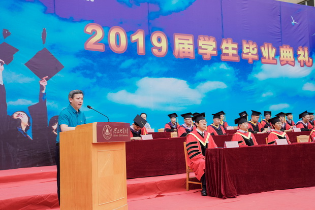校长王凤鸣发表致辞,向即将毕业的同学们表示热烈祝贺,向辛勤养育、悉心教导、帮助同学们成长的父母、老师及朋友们致以崇高的敬意和衷心的感谢。他说,你们是学校最后一批以石家庄经济学院新生身份入学,以BB贝博艾弗森官网毕业生身份毕业的学生。几年来,你们怀着青春的激情与梦想,与学校共同成长。学校成功更名、进入省属重点骨干大学序列、接受本科教学工作审核评估,有你们的拼搏与付出,母校也欣喜地看到了同学们的成长。王凤鸣校长在毕业典礼的现场还列举了许许多多2019届毕业生的优秀代表,赞扬了同学们在BB贝博艾弗森官网求学期间,用行动践行了“学向勤中得”,用每一日的认真雕刻出了精彩的大学时光。