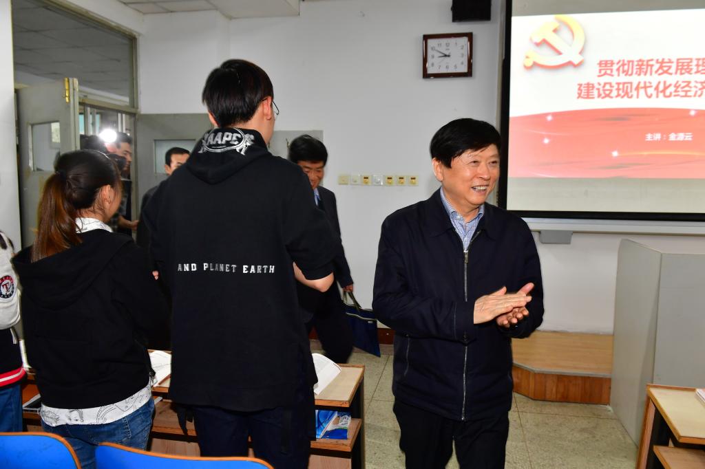 同学们认真倾听,踊跃发言,课堂气氛活跃,邢国辉也与同学们一起认真记录讲授要点,不时点头赞许。课后,邢国辉对金源云老师的授课内容及授课形式给予了高度评价,认为这堂思政课,内容深入浅出、丝丝入扣,形式生动、形象、吸人眼球,充分做到了将习近平新时代中国特色社会主义思想进教材、进课堂、进头脑。