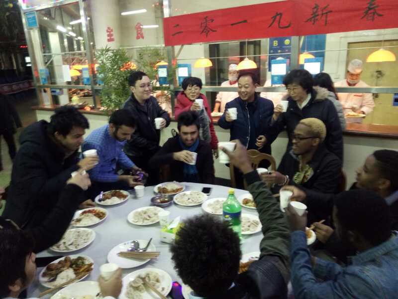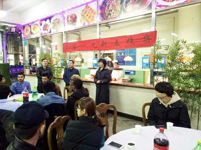 傍晚,副校长张小平在后勤集团易铁山总经理和国际教育交流处廖亦斌处长的陪同下,来到了张灯结彩、喜气洋洋的学生餐厅,与留宿的中外学生们齐聚一堂,品佳肴、话祝福、同庆同乐共度除夕夜。席间,张小平副校长携易铁山和廖亦斌与在座的每一位学生举杯同庆送祝福,并致以新年的问候。在场的师生们纷纷举杯,祝愿学校发展越来越好。相互祝福在新的一年里身体健康,学习进步,万事如意!欢乐的除夕夜、美味的年夜饭、浓浓的师生情,此情此景,让未能回家过年的学生及远在异国他乡的外国留学生们,无不感受到在河北地大“家”的温暖,这是一种不是亲情胜似亲情的浓浓的“家文化”。