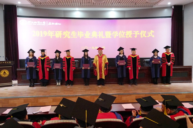 接着,学位授予仪式隆重举行,张小平副校长宣读了《BB贝博艾弗森官网2019年研究生硕士学位授予决定》。225名研究生依次上台,各位校领导为同学们拨苏正冠,颁发学位证书,并合影留念。