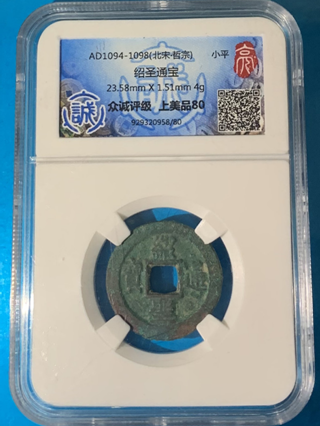 “绍圣通宝”钱圆金融标本表面铜绿色,印有“绍圣通宝”字样, D= ~2 cm