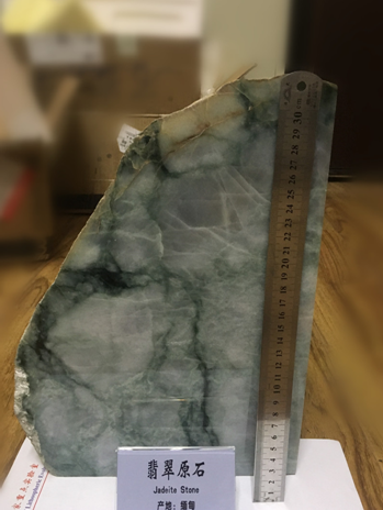 檀国平先生捐赠的翡翠原石重24千克,产自缅甸翡翠矿区,种质细腻密度高,颜色呈团块状网状分布,绿色老辣,是翡翠花件和摆件上乘原料。从切面可以看到翡翠岩石多次破碎胶结再成岩过程,重叠展现了形成破碎角砾岩的动力变质遗迹,这是印度洋板块向欧亚板块俯冲最活跃的缝合地带——缅甸北部送给人类最靓丽的瑰宝,是翡翠成矿过程展示的上等标本。