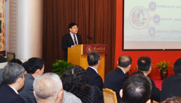 王凤鸣简要介绍了学校的办学历史、办学成绩、学科发展、教学情况、师资队伍建设等。他指出,65年的发展,学校经历了三次隶属关系的变更、一次办学地点的整体搬迁、三易校名。这些变化的背后,是一代代河北地大人在面对内外部环境变化时所展现出的坚守与进取。特别是学校更名大学以来,国家、社会、行业以及师生对学校的发展给予了更高的期望,学校发展也进入了一个全新的时期。新时期,学校具体举措与成效为:找准历史方位,努力构建开放办学新格局;稳步推进教育教学改革,努力办高质量有特色的本科教育;抓好师资队伍建设,集聚发展核心力量;夯实“山水文化”根基,激发河北地大精气神。
