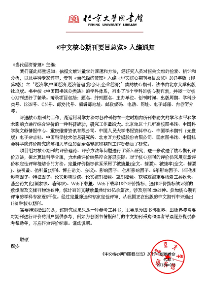 近日,北京大学出版社出版《中文核心期刊要目总览》(俗称“北大中文核心期刊”)2017年版(即第8版),BB贝博主办的《当代经济管理》作为“经济学,中国经济,经济管理(除会计,企业经济)”类核心期刊入选。这是《当代经济管理》首次被其收录,是继成为CSSCI扩展版来源期刊和RCCSE中国核心学术期刊之后迈上的又一个新台阶。