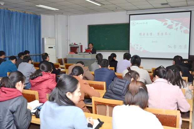 蔡建章从《中国共产党章程》、《中国共产党纪律处分条例》和《监察法》为切入点,强调“纪在法前,纪比法严”,要求所有新入职教师要警钟长鸣,防患于未然。首先,要坚定政治立场,做政治上的明白人。老师们应坚定政治立场,坚定自觉地同以习近平同志为核心的党中央保持高度一致,将“修身自重”贯彻于日常工作与生活中。蔡建章强调,老师要有底线意识;要不忘初心,牢记教师的使命是教书育人,要做到信仰回归、使命回归和责任回归;要加强学习,提高素质养成。其次,把规矩意识内修于心,外化于行。蔡建章强调,政治规矩是底线,规矩意识是思想品德和道德操守的体现,是一种准则,一种尺度,一种境界,做一个政治上的明白人,道德上的纯粹人,专业上的引领人,纪律上的规矩人,这是新常态下对高校教师提出的要求。