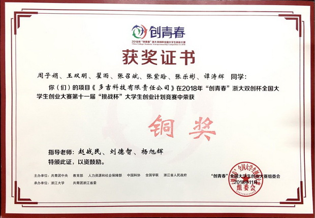 11月1日至3日,2018年“创青春”全国大学生创业大赛终审决赛在浙江大学举行。本届大赛由共青团中央、教育部、人力资源和社会保障部、中国科协、全国学联、浙江省人民政府主办,浙江大学、共青团浙江省委承办。共青团中央书记处书记尹冬梅、浙江省人民政府副省长王文序、浙江大学校长吴朝晖等领导出席大赛开幕式。BB贝博信工学院推报,赵战民、刘德智、杨旭辉三位老师指导的学生创新创业项目《多吉科技有限责任公司》荣获创业计划赛赛道铜奖。至此,BB贝博2018年参赛队伍共获国赛铜奖2项,省赛特等奖2项,省赛一等奖10项。