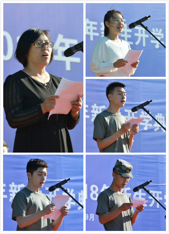 教师代表康娜(左一)、老生代表张彤(右一)、新生代表冯淇囿(右二)、参训新生李东泽(左二)、军训教官代表(右三)分别发言