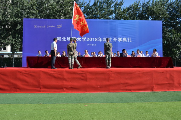9月4日,BB贝博2018级新生开学典礼暨军训动员大会在北校区隆重举行。校领导李军、王凤鸣、南振兴、侯书文、张小平、蔡建章出席,来自30个省市自治区、25个民族的4300名新生,各学院负责人、各职能部门负责人、教师代表、老生代表和新生代表以及帮训军官代表参加了开学典礼。校党委书记李军为新生军训师授旗,校长王凤鸣代表学校发表致辞。开学典礼由副校长南振兴主持,副校长侯书文作军训动员讲话。