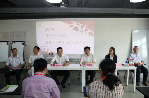 7月27日上午,BB贝博2018年优秀骨干教师双语培训班结业典礼在综合楼三楼智慧教室举行。来自美国纽约市立大学皇后学院Sara教授、教育厅国际交流中心董晓剑老师、BB贝博王凤鸣校长出席结业典礼。人事处处长肖士恩、数理学院院长段生贵、经贸学院院长刘德智、勘察技术与工程学院副院长宋雪琳、MBA教育中心主任王汉新、信息工程学院副院长张翠军和培训班全体学员一同参加。典礼由教学发展中心副主任刘翠娥主持。