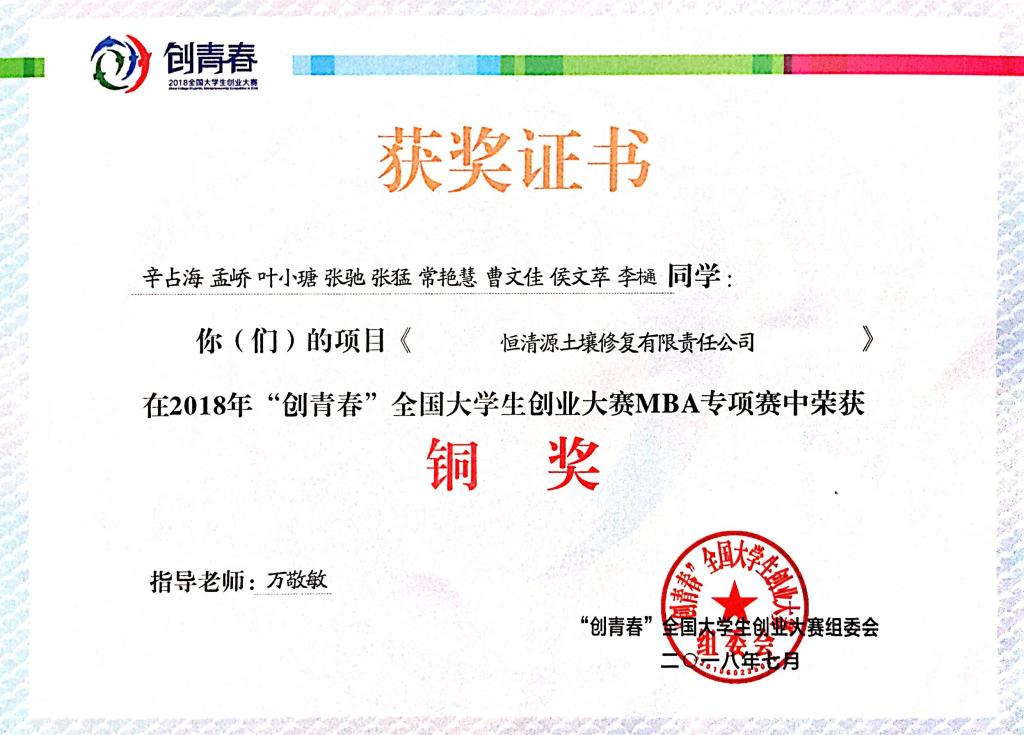 本次专项赛自2018年3月份启动以来,共有1708件作品参赛,经全国组委会审核后共有954件作品入围全国复赛。全国复赛采用网络评审的方式进行,评委根据项目陈述、市场分析、创业思路、市场营销等相关情况进行逐一评分,共评出100个MBA项目入围终审决赛。在通过书面评审、现场答辩、公开展示、会议合议等环节后,BB贝博由万敬敏、韩占涛老师指导的《恒清源土壤修复有限责任公司》创业项目在终审决赛中脱颖而出,斩获国家铜奖。
