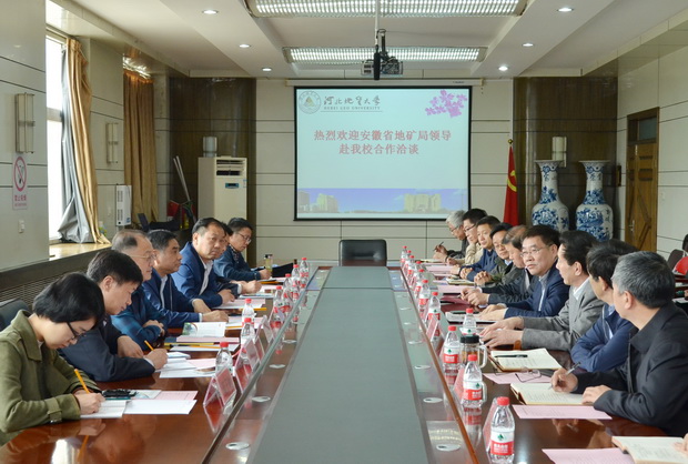 4月25日下午,安徽省地矿局副局长施申轶带领该局311地质队、水文地质环境处、人事处、经济发展处和安徽省地调院主要负责同志来BB贝博调研,进行全面合作洽谈。洽谈会在主楼四楼会议室举行。校长王凤鸣、党委副书记刘耀辉及相关职能部门、相关学院主要负责人参加了洽谈会。