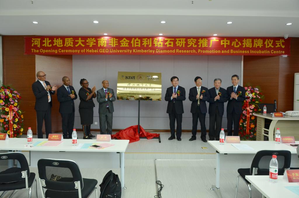 在全场热烈的掌声中,舒舒先生、基伽巴女士、范德罗斯先生、斯蒂坎普先生和王凤鸣校长、刘嘉麒院士、王仲德局长、侯建国处长共同为BB贝博艾弗森官网南非金伯利钻石研究推广中心揭牌。