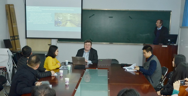 在信息工程学院会议室,弗拉基米尔.克雷洛夫教授首先作了《研发用于通信和控制使用在煤矿,铀矿及在伴生气体(甲烷,氡气等)浓度高的矿井的专用矿山开采机械多功能装置》报告,并与BB贝博教师进行了简短的学术交流。报告后,双方就两校合作交流事宜进行了轻松友好会谈,并达成一致,希望能在地质勘探安全与网络信息安全方面继续开展学术交流与合作,加强两校互访。信息工程学院院长亢俊健主持会议。