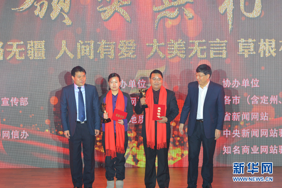 河北省委宣传部部务会成员、省委网信办副主任牛兰东(右一)和河北省卫计委党组副书记、副主任徐春芳(左一)为获奖人物颁奖。新华网秦家宝 摄