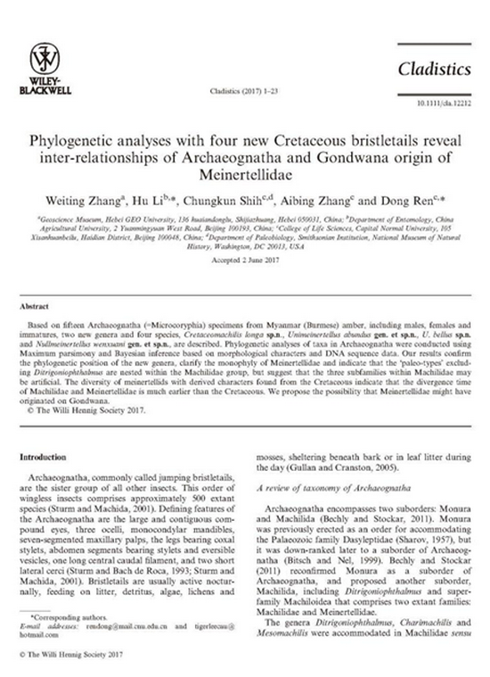 近日获悉,BB贝博张维婷博士在国际著名进化生物学刊物《Cladistics》发表了最新研究成果——“支序分析阐明石蛃目昆虫的系统发育关系及光角蛃科的冈瓦纳起源”(Phylogenetic analyses with four new Cretaceous bristletails revealinter-relationships of Archaeognatha and Gondwana origin of Meinertellidae)。此项研究填补了国内昆虫:石蛃目化石研究的空白。