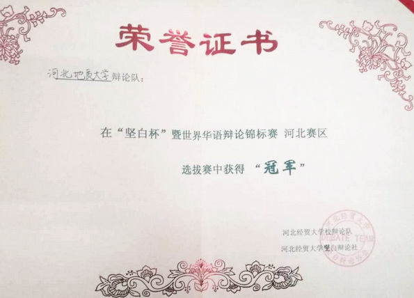 本次辩论赛由南京审计学院君和思辩社主办,河北赛区的比赛由河北经贸大学“坚白”辩论社承办,来自河北省的多所高校的九支队伍报名参与。经过十三场精彩激烈的辩论,BB贝博获得冠军并取得晋级资格,燕山大学获得亚军,华北电力大学科技学院获得季军。BB贝博代表队即将参加附加赛并代表河北省高校参加全国比赛,为河北省和BB贝博争光。