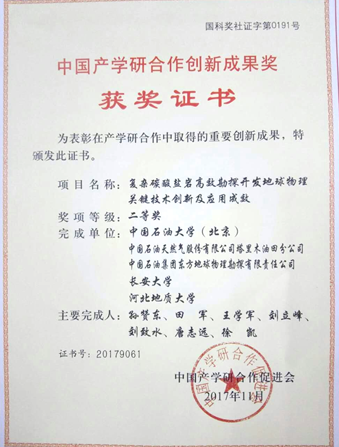 这项成果是由唐志远博士作为主要参与人之一,中石油塔里木油田分公司、中石油东方地球物理公司、长安大学合作完成的“复杂碳酸盐岩高效勘探开发关键地球物理创新技术及应用成效”。该成果针对世界上最复杂的塔里木盆地碳酸盐岩油气藏勘探开发中存在的难题展开技术攻关,形成一套适合塔里木盆地超埋深碳酸盐油气藏上产增储关键技术,为实现塔里木盆地超埋深碳酸盐岩油气藏的高效开发提供了强有力的技术支持,为“十二五”期间塔里木油田的增产、稳产发挥了重要作用。