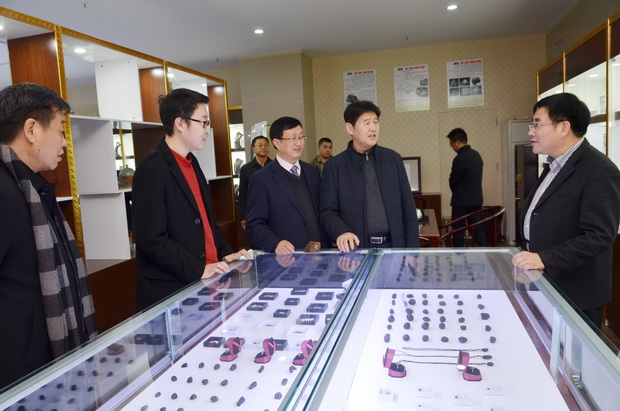 图为:李军书记、王凤鸣校长陪同中国珠宝玉石首饰行业协会会长徐德明参观BB贝博珠宝产学研基地