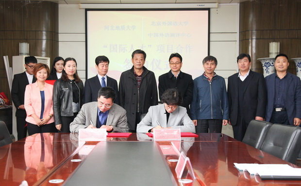 图为:张小平副校长与王文斌主任签署合作备忘录