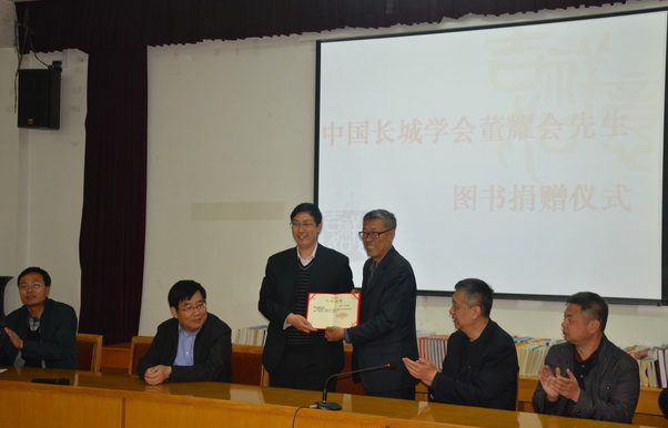 捐赠仪式上,董耀会先生简要介绍了他徒步考察长城、在北京大学进行长城学研究的经历。他说,研究学问主要在于读书。自己对长城的研究主要得益于在北京大学研修时期的“读架”,通过阅读一架架历史文献对长城学研究领域有了整体认识。随着研究的逐步深入,他积累了丰富的有关长城学研究的图书文献资料。这次将这些图书文献捐赠给学校图书馆,可以提供给更多老师、学生使用。