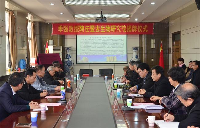 张小平宣读了《BB贝博艾弗森官网关于聘用季强特聘教授的决定》和《BB贝博艾弗森官网关于成立古生物研究院的决定》。王凤鸣代表学校与季强教授签订了特聘教授聘任协议并颁发聘书(特聘教授证书和古生物研究院首席科学家聘书)。