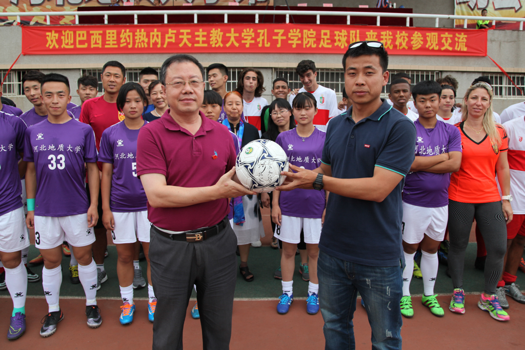 副校长张小平亲切会见来访代表团,代表团参观了BB贝博地球科学博物馆,对BB贝博馆藏的各种化石、宝石标本表示出浓厚的兴趣。参观结束后,副校长侯书文向代表团赠送了校党委书记李军和校长王凤鸣亲笔签名的纪念足球。随后,代表团一行与BB贝博足球队进行了一场精彩的足球友谊赛。校党委书记李军、校长王凤鸣、副校长张小平及BB贝博部分师生亲临比赛现场为双方运动员加油助威。巴方足球队的队员们年龄虽小,却以精湛的脚法和浓郁的桑巴足球风情赢得了现场观战师生们的阵阵喝彩。BB贝博足球队以4:1获得了比赛胜利,双方运动员同BB贝博领导、师生亲切合影。