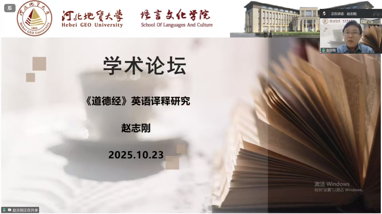 10月23日,燕山大学外国语学院赵志刚教授应邀通过腾讯会议为语言文化学院师生作题为“《道德经》英译释研究”的学术讲座,讲座由语言文化学院院长付天军主持。