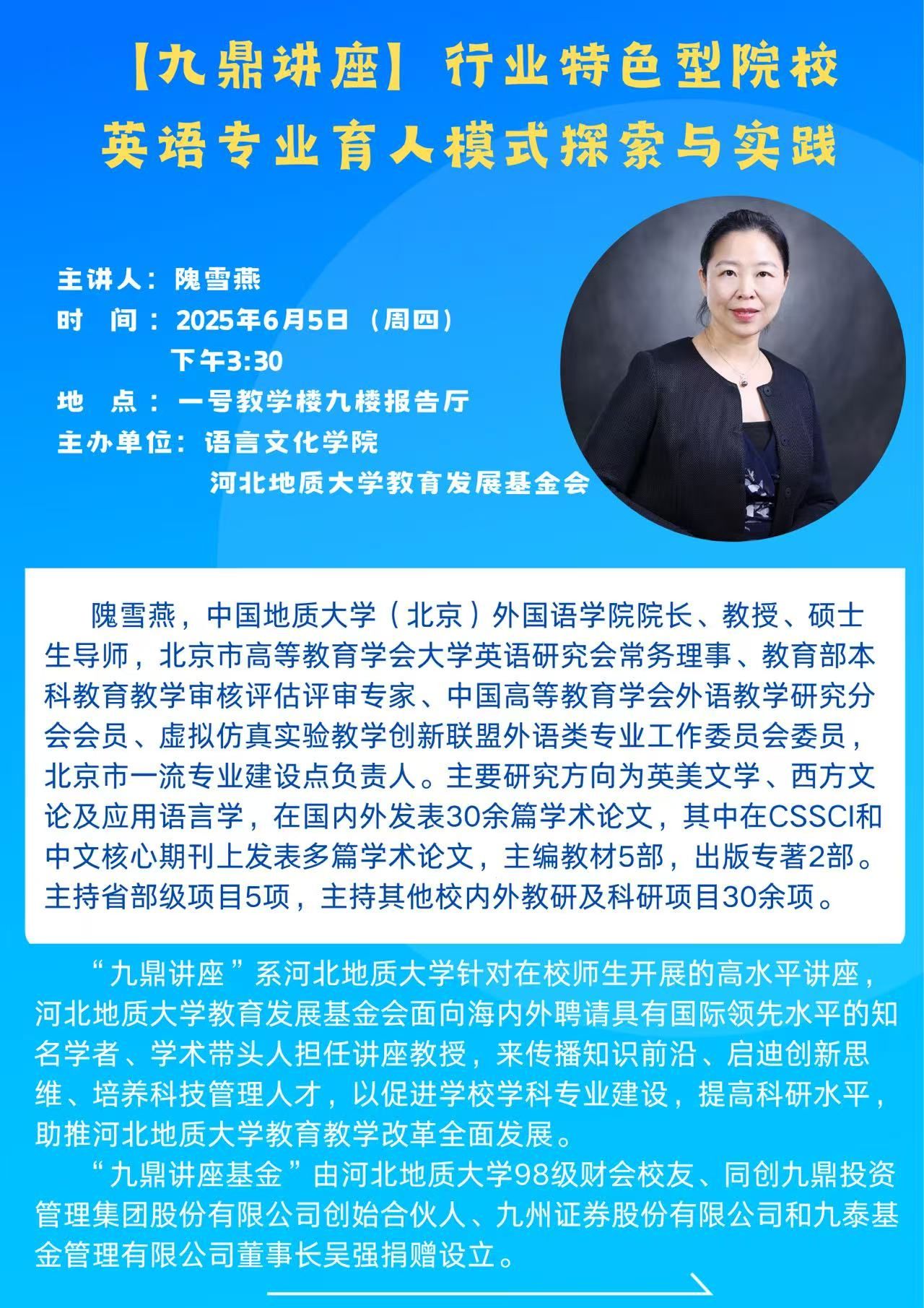 【专家河北行信息预告】“九鼎讲座”系列学术报告 中国地质大学(北京)外语学院院长隗雪燕:行业特色型院校英语专业育人模式探索与实践