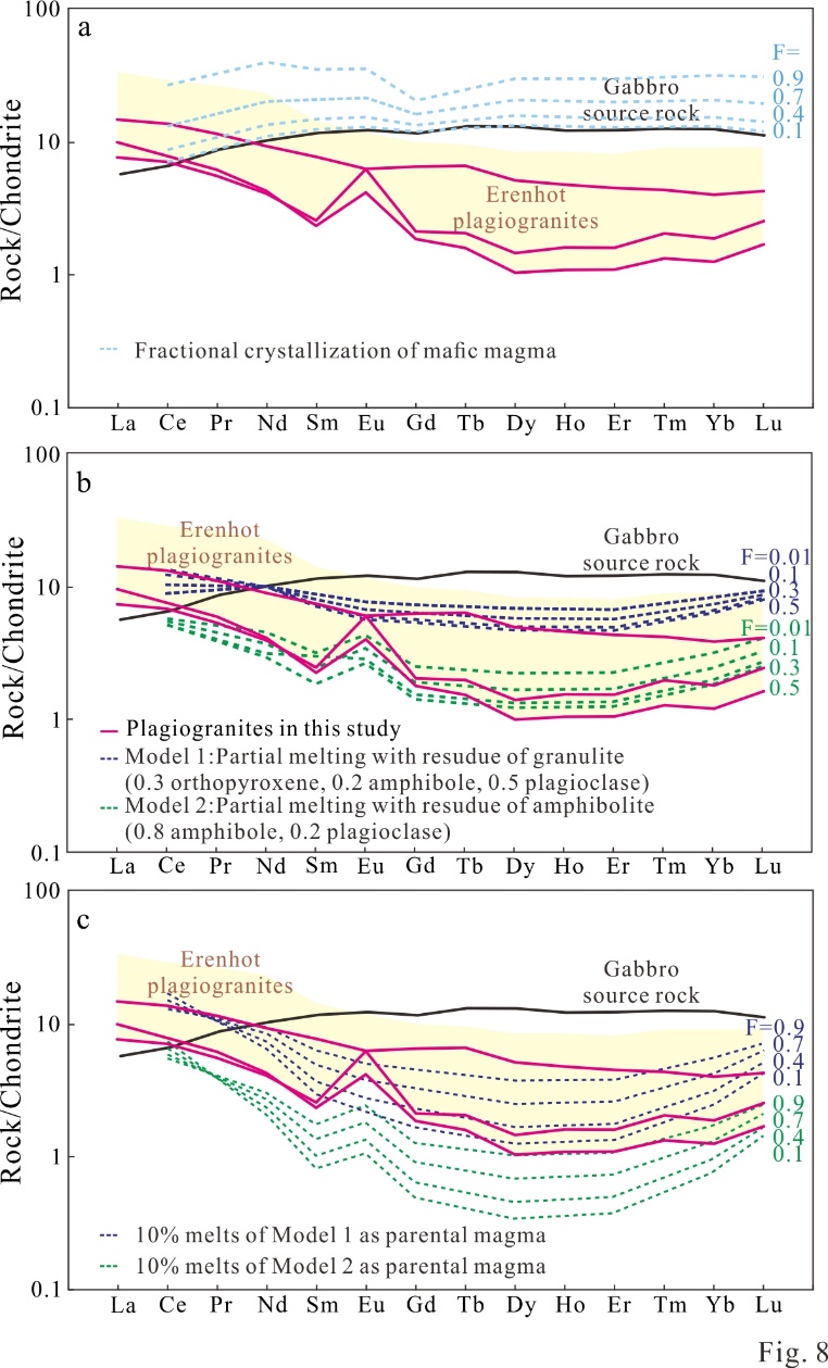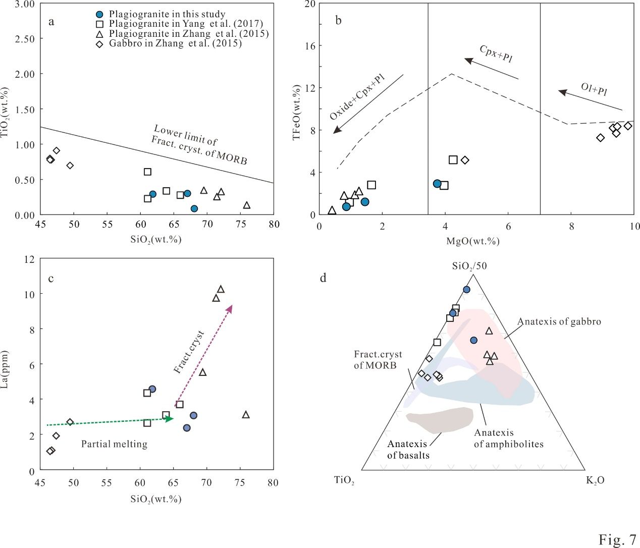 3) 主量元素的显著变化及其与SiO₂的系统性变化、多样的Eu和Sr异常以及稀土模拟结果表明(图5和6),部分熔融成因的斜长花岗岩母岩浆可能经历了两个阶段的矿物分异结晶:早期以单斜辉石、角闪石和钛磁铁矿分离结晶为主,后期则以斜长石堆晶以及角闪石和钛-磁铁矿分离结晶为主。