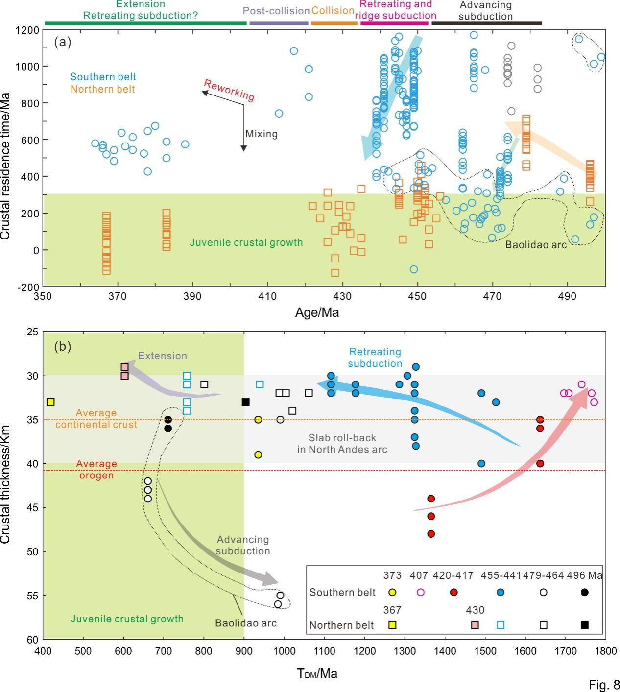 5) 奥陶纪从前进式俯冲到后撤式俯冲的转变驱动了地壳厚度和地壳演化过程的系统性变化,例如地壳演化从大范围古老地壳再造和靠近俯冲带少量新生地壳熔融,转变为新生地壳物质熔融及其与古老地壳物质混合;晚志留世晚期和早泥盆世弧-陆碰撞后伸展垮塌诱发了元古宙沉积岩的广泛重熔,而中泥盆世至晚泥盆世的持续伸展促进了大量新生下地壳的部分熔融(图3)。
