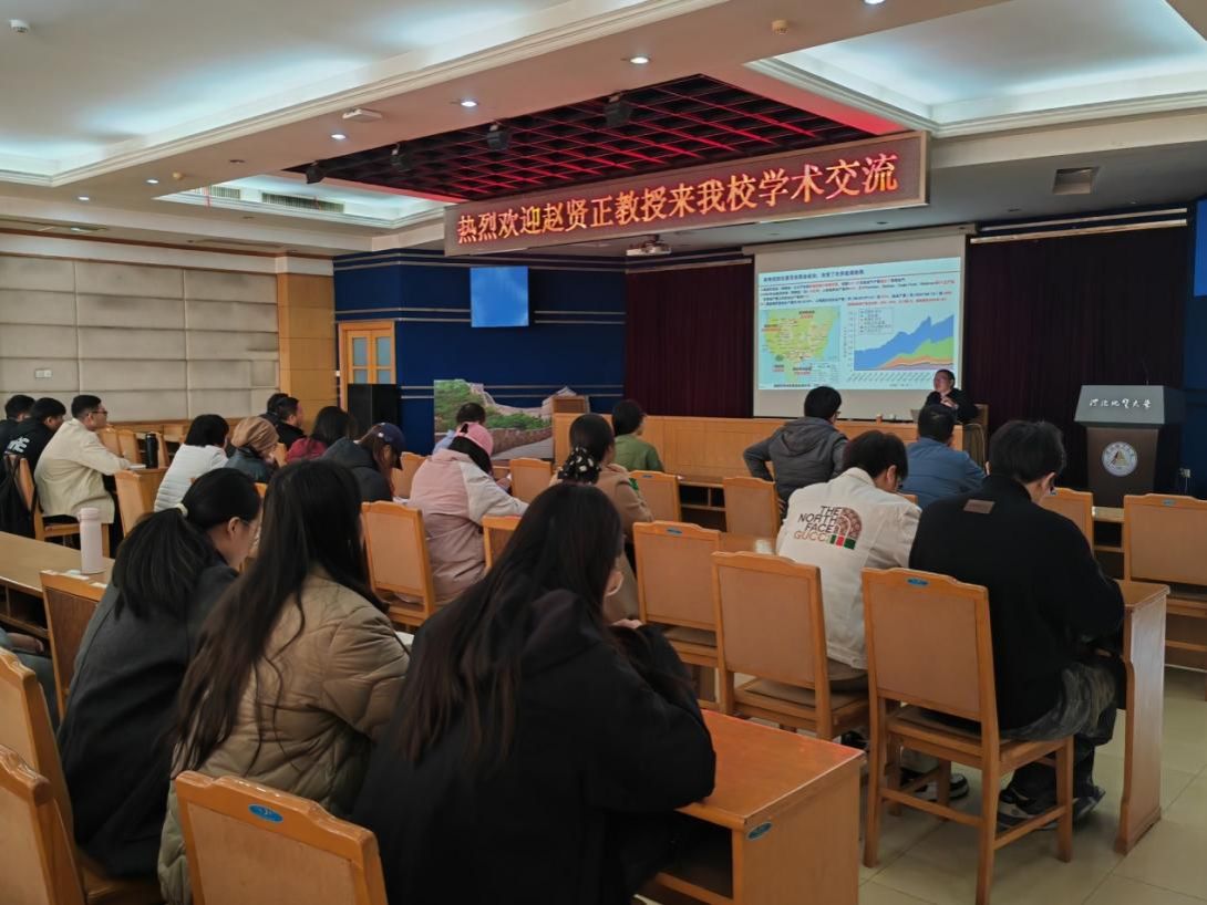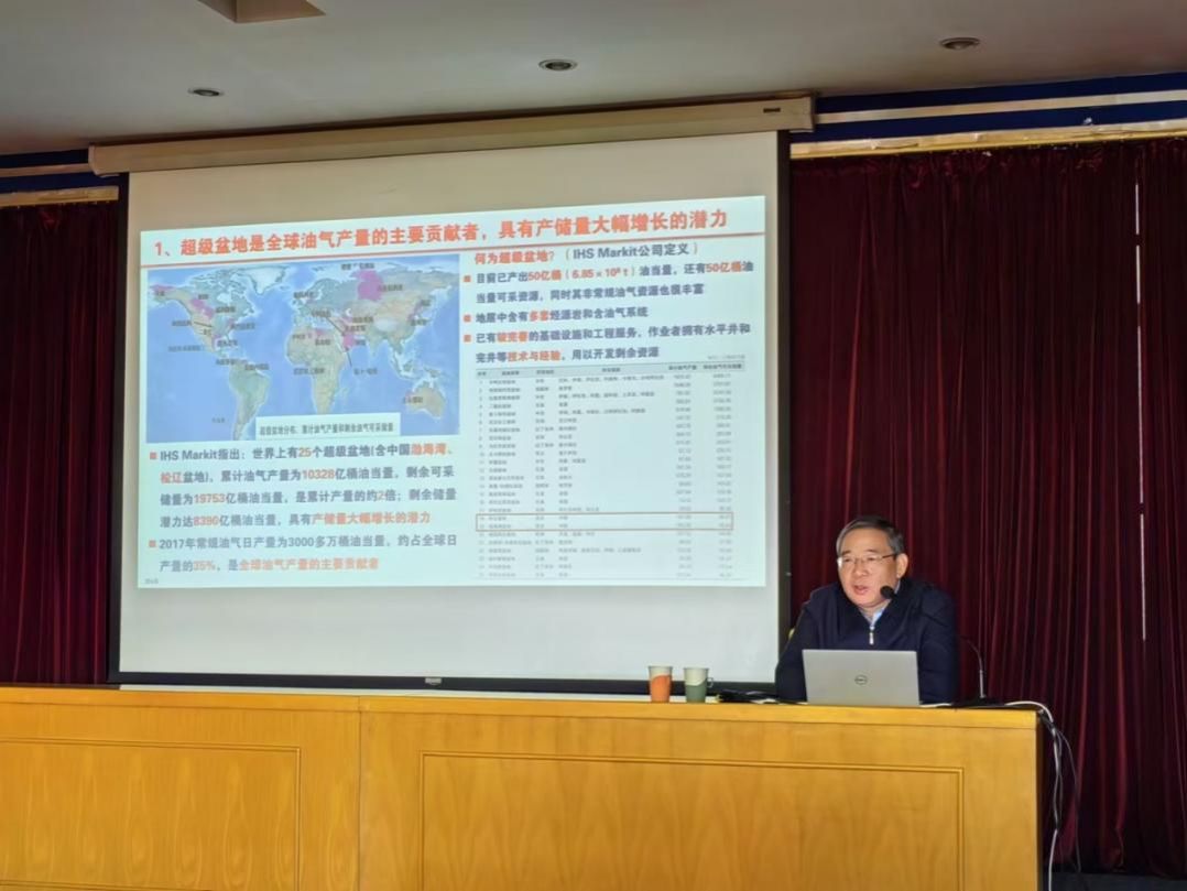 赵贤正教授以自身工作经历讲述了超级盆地模式思维及其对油气勘探的推动作用,依据超级盆地理论在渤海湾盆地陆相页岩油富集规律、页岩油效益开发方面的成就和突破。赵教授一直从事油气成藏理论研究与技术实践,报告中他提出了高质量发展与四创新四破解(理念创新破解观念禁区,理论创新破解认识雾区,技术创新破解目标盲区,管理创新破解成本雷区)的哲学感悟。赵贤正教授的案例式讲解激起了学生们的兴趣,为我院地质类学生进行了科普及引导。