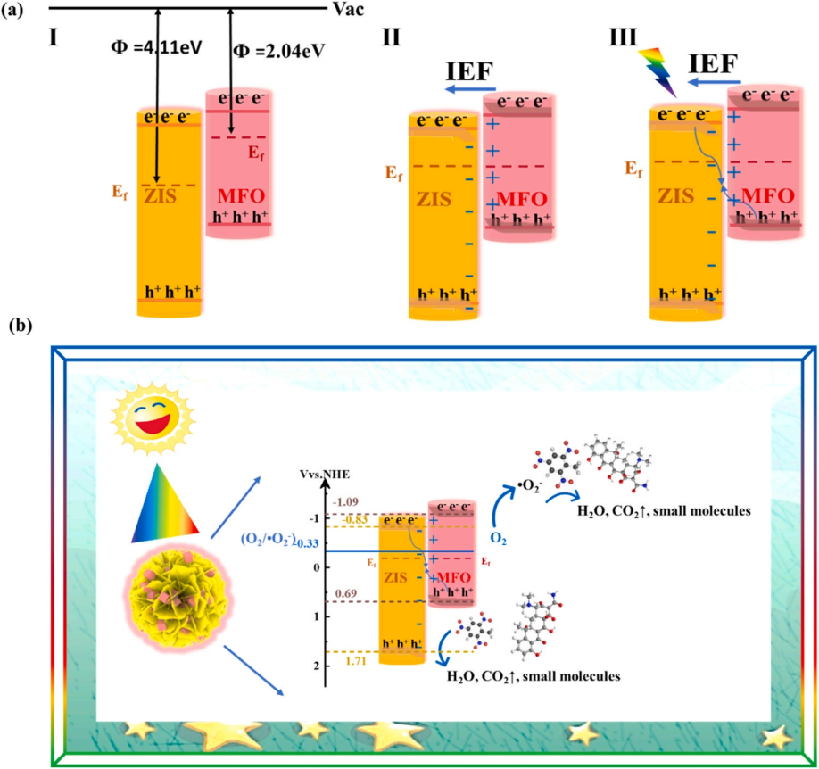 图3. MFO/ZIS S-scheme型异质结体系的构造与反应机理图