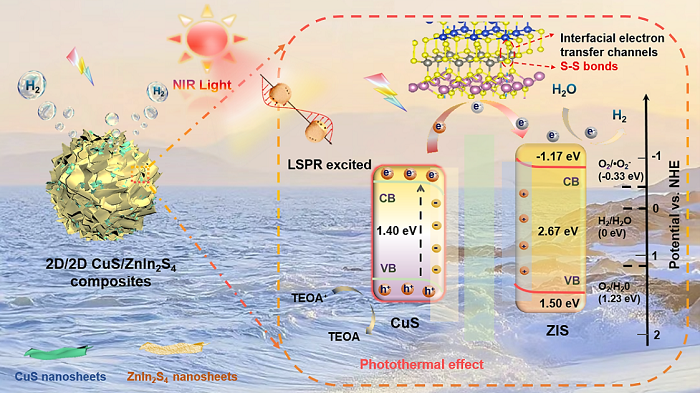 图5. 具有界面S-S键的2D/2D CuS/ZnIn2S4复合材料增强光热辅助NIR驱动光催化制氢的机理图