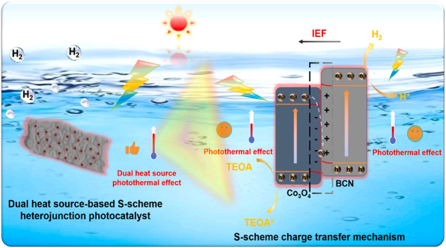 图6. 基于双热源的Co3O4/BCN S型异质结光热辅助光催化制氢机理图