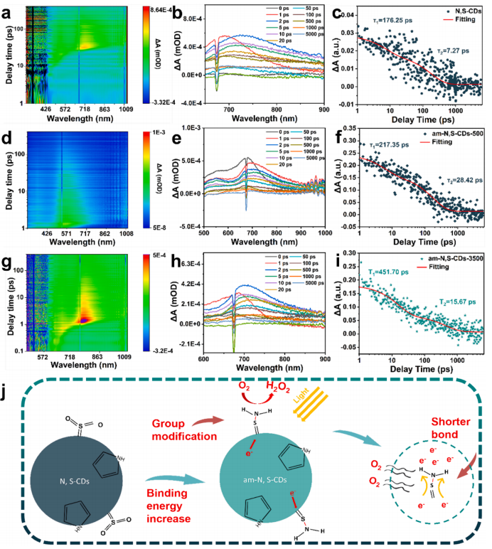 图1. (a, b) N, S-CDs的飞秒瞬态吸收光谱。(d, e) am-N, S-CDs-500。(g,h)am-N,S-CDs-3500。(c) N, S-CDs,(f) am-N, S-CDs-500和(i) am-N, S-CDs-3500的归一化瞬态吸收光谱的时间曲线。(j) am-N, S-CDs在光催化生成H2O2过程中的氨基修饰示意图。