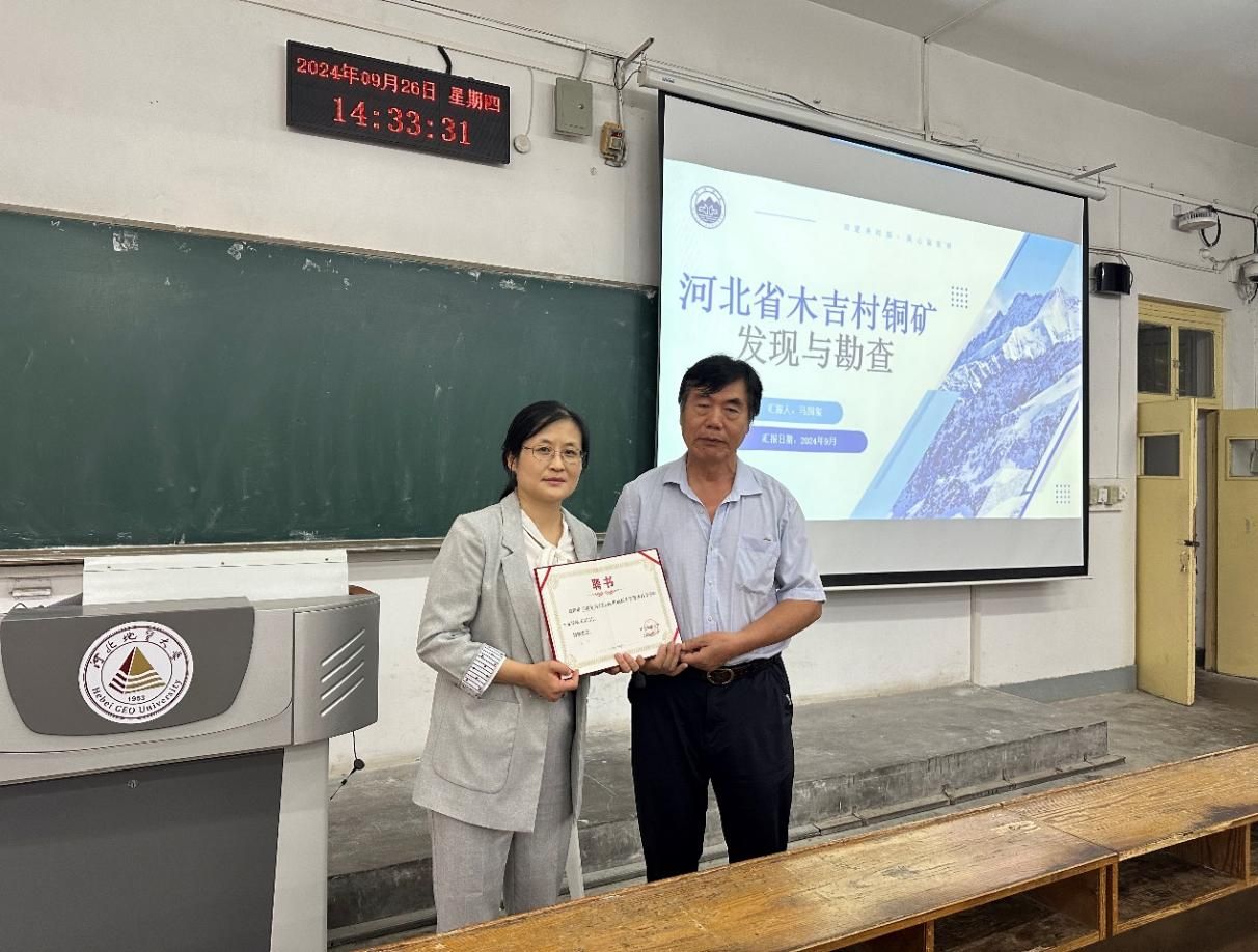 为了进一步落实资源勘查工程专业应用型转型示范专业的建设任务,践行BB贝博校企融合的办学理念,培养适应新时代地质工作要求的应用型、复合型人才,地球科学学院邀请BB贝博杰出校友、河北省著名找矿专家、河北省地质工程勘察院原总工程师马国玺教授来BB贝博作了《河北省木吉村铜矿发现与勘查》报告。地球科学学院副院长李英杰教授主持了报告会,并为马国玺教授颁发了企业导师聘书。资源勘查工程专业三年级和四年级学生及部分其它专业学生和研究生参加了报告会。