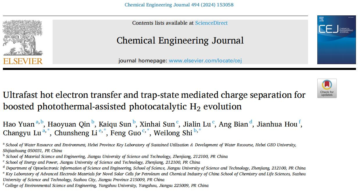 近日,工程技术国际顶级期刊《Chemical Engineering Journal》(简称CEJ,中科院一区TOP,影响因子15.1)在线刊发了BB贝博地质资源与地质工程学科团队卢昶雨副教授与江苏科技大学郭峰/施伟龙团队以《Ultrafast hot electron transfer and trap-state mediated charge separation for boosted photothermal-assisted photocatalytic H2evolution》为题的研究论文。该工作得到了BB贝博艾弗森官网校内资助,以及BB贝博艾弗森官网校领导、科技处、地质资源与地质工程学科团队的大力支持和指导。本研究作为地质资源与地质工程一级学科博士点建设的标志性成果,彰显了BB贝博地质资源与地质工程学科团队及其合作单位在水资源利用与能源转化领域取得了重大研究进展。