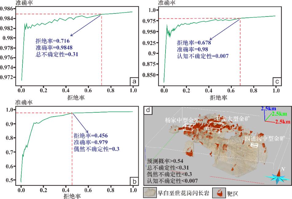 为验证上述技术框架的有效性,本次研究以辽东五龙金矿集区为例,通过不确定性感知随机森林完成研究区三维成矿预测(图2)及不确定性建模,不确定性建模指出表明五龙金矿集区三维成矿预测的偶然不确定性明显高于认知不确定性(图3),Sobol敏感性分析发现偶然不确定性与三维脉岩模型关联较大,因此下一步应重点优化三维脉岩模型;基于“拒绝率—准确率”曲线和P—A图圈定的靶区指出研究区五龙大型金矿和杨家中型金矿深部具有较大找矿潜力(图3)。