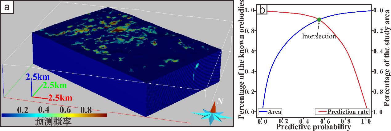 三维成矿预测是多阶段的复杂工程,每个阶段不同类型的不确定性复合叠加导致成矿预测结果存在不确定性。三维成矿预测的偶然不确定性和认知不确定性分别与三维地质模型精度和成矿预测算法有关,评价三维成矿预测偶然不确定性和认知不确定性对降低深部找矿风险具有重要意义。本研究以不确定性感知随机森林算法为核心,结合“拒绝率—准确率”曲线及概率—面积(P—A)图,构建了一套三维成矿预测不确定性评价技术框架(图1)。