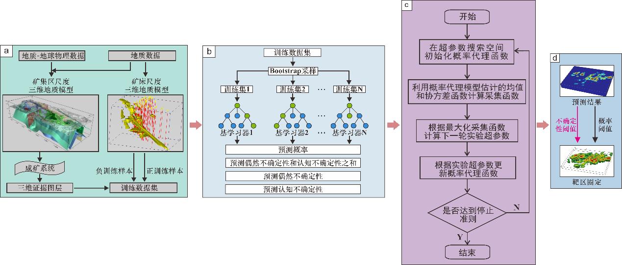 图1基于机器学习的三维成矿预测偶然不确定性和认知不确定性评价流程图:(a)三维建模及成矿信息提取;(b)不确定性感知随机森林算法;(c)贝叶斯超参数优化;(d)通过概率和不确定性圈定找矿靶区。