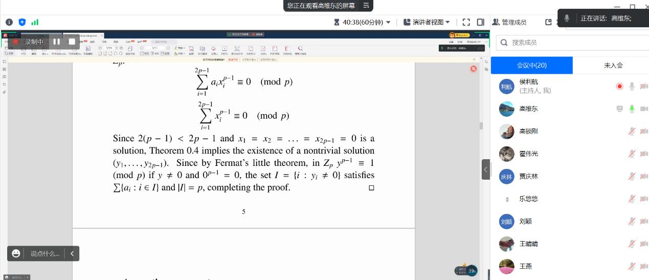 2023年6月12日,数理教学部邀请天津大学高维东教授为BB贝博师生作了题为《Erdos-Ginzburg-Ziv定理的十个证明》的线上学术报告。数理教学部部分教师和全体研究生参加了学术报告会。