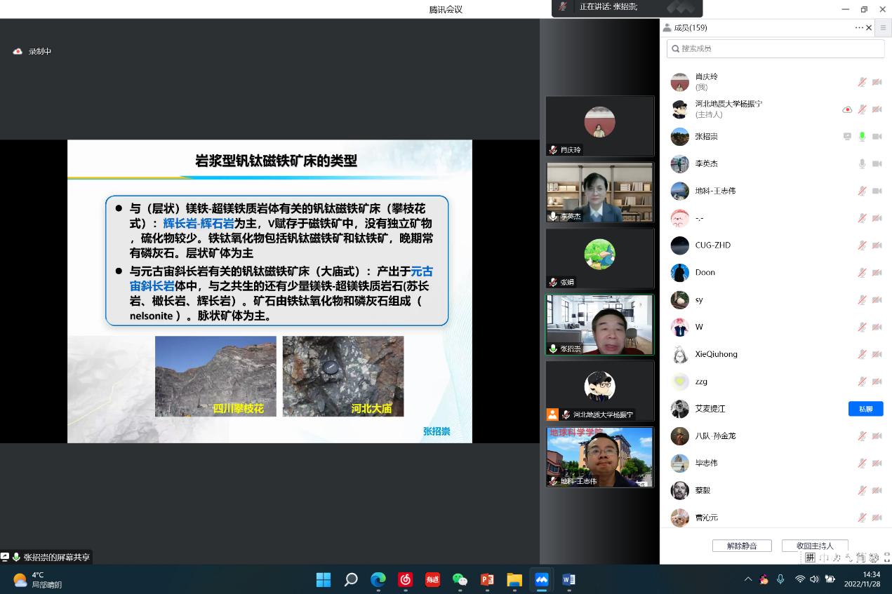 2022年11月28日,中国地质大学(北京)张招崇教授应邀在腾讯会议为BB贝博师生作了题为“河北大庙斜长岩体型铁矿床的形成机制”的学术报告。河北省地矿局、河北省地质调查院、河北省地矿局、河北省地矿局第四地质大队、河北省地质工程勘察院、中国地质大学(北京)、新疆地矿局等多家单位,以及BB贝博地球科学学院师生共230余人参加了此次学术报告。报告会由地球科学学院副院长李英杰教授主持。